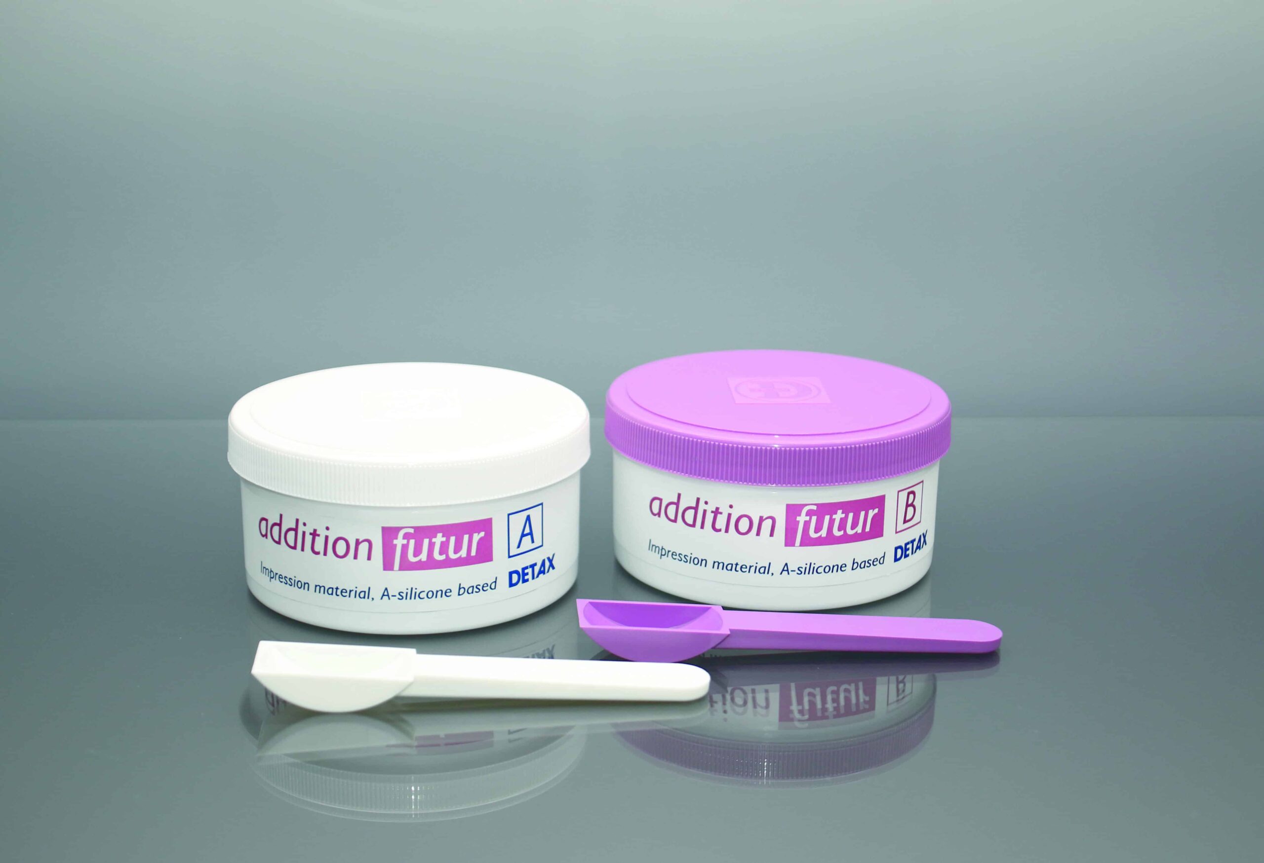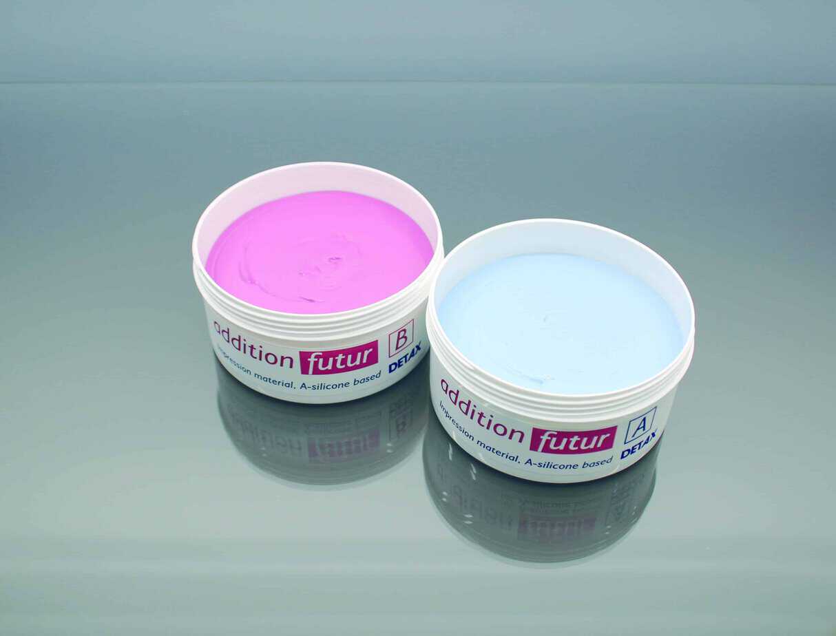 Maximum softness & homogeneity, pressure-forming, non-sticky. High detail reproduction, tear- and tensile strength, dimensionally stable. Easy removal and mixing: mixing ratio 1:1 optimum mixing control by contrast colours, violet/light blue. A-silicone, final hardness: approx. 25 Shore A, scent: lemon